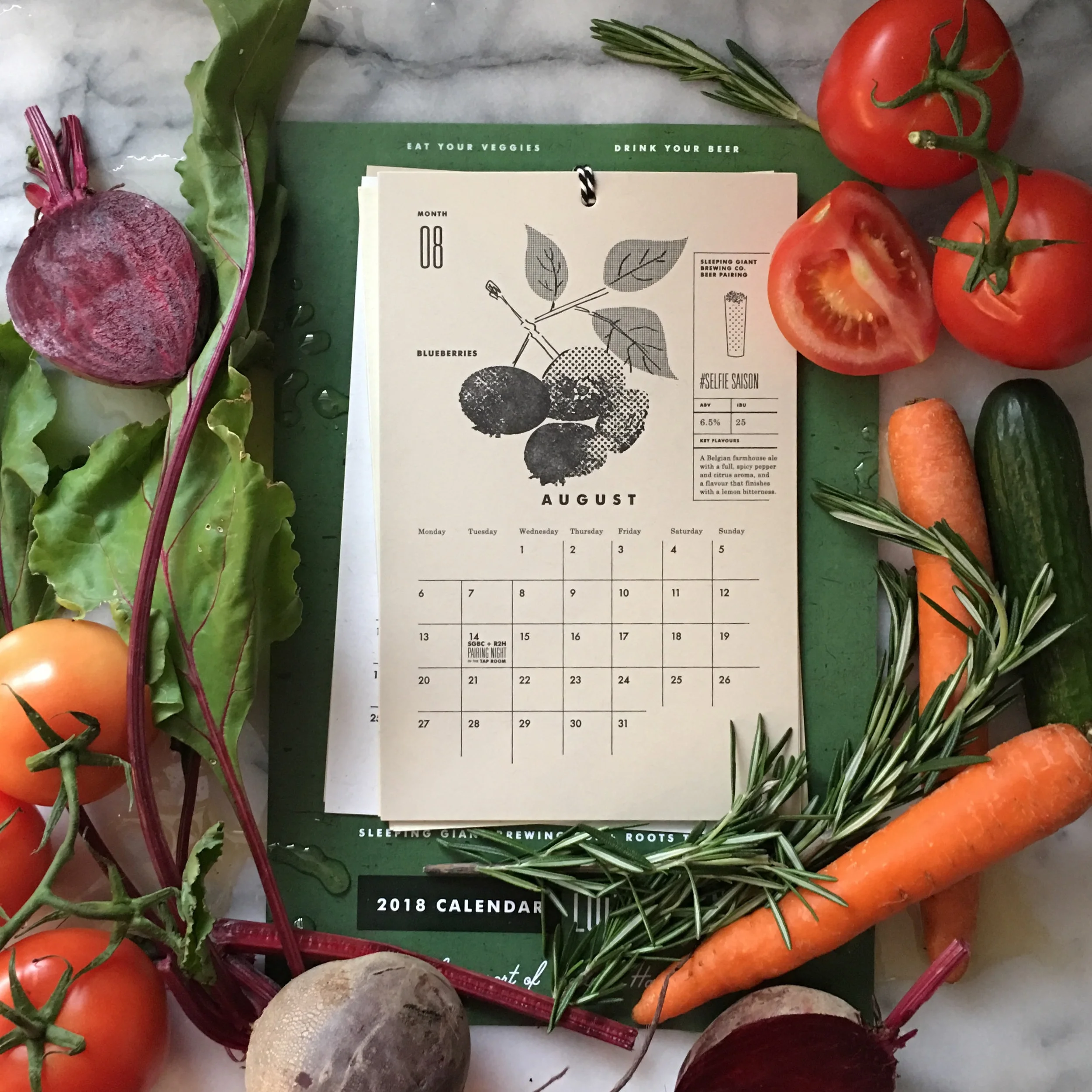 An illustrated calendar pairing local beer and produce, commissioned by Thunder Bay's Sleeping Giant Brewery with all proceeds going to Roots to Harvest, food education and youth employment.